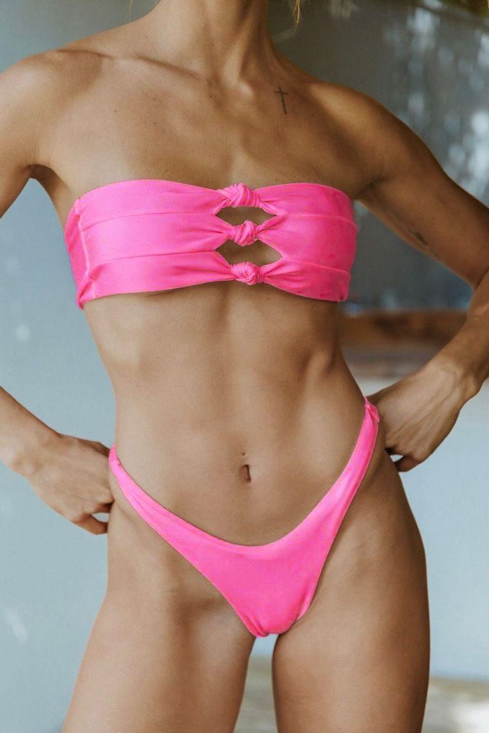 Biquíni Button Rosa Chiclete : Top no estilo faixa, super confortável e versátil, possui três nós que deixam aquele charme (fixa e não possui bojo). A calcinha é no modelo tradicional, com recorte nas laterais.