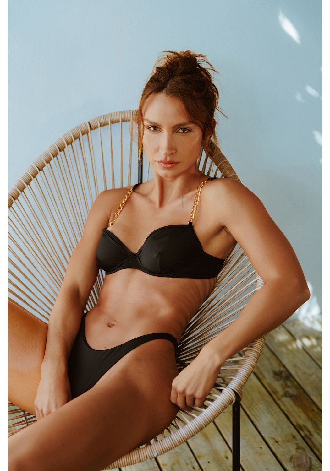 Biquíni Roma Preto :O glamour do preto com o toque sofisticado do dourado!Esse biquíni é puro luxo e estilo. Ideal para quem busca um visual ousado, moderno e cheio de estilo na praia ou na piscina.O top possui regulagens (sem Bojo) possui modelagem estruturada com alças duplas — sendo uma com detalhe em corrente dourada, que dá um toque de glamour à peça. A calcinha com o bumbum em modelagem mais tradicional. modelagem que valoriza o corpo e forro interno para maior conforto.