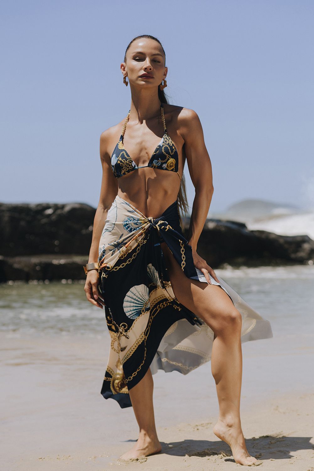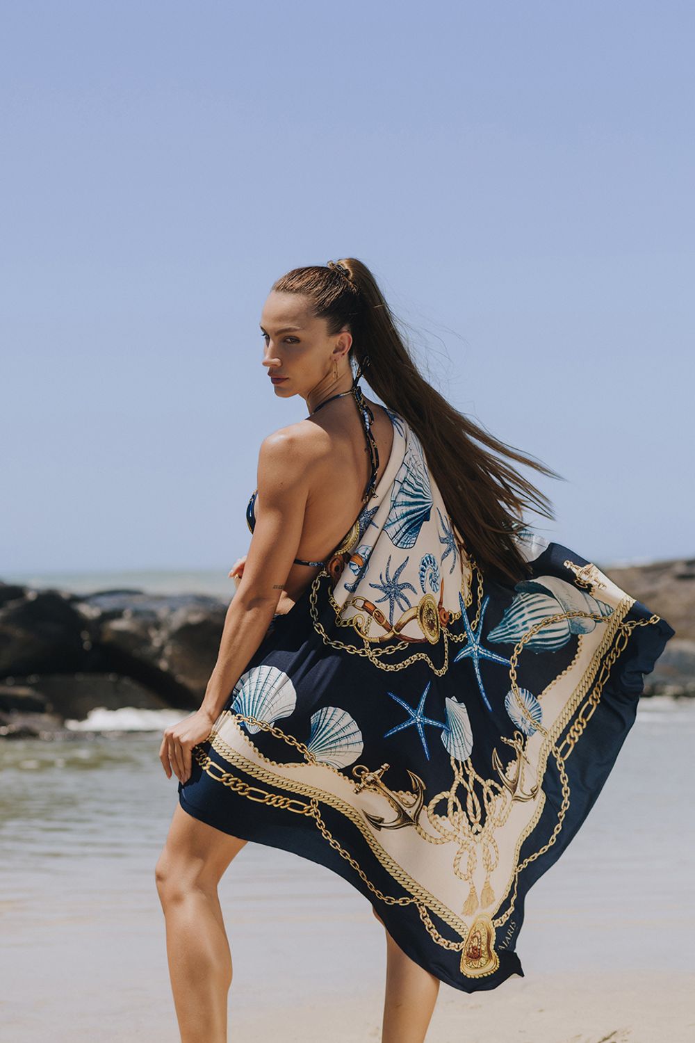 Canga pareou Atlântica (estampa exclusiva): Canga Luxo Náutica Conchas e Correntes Super confortável e com diversas possibilidades de uso e amarrações, em tecido leve e de toque suave,, é perfeita para usar como saída de praia, echarpe Um acessório versátil e cheio de charme que combina com qualquer look resort chic.peça delicada ideal para dias de praia e piscina. traz uma estampa sofisticada inspirada no universo marítimo, com conchas, estrelas-do-mar, âncoras e correntes douradas, criando um visual luxuoso e atemporal.