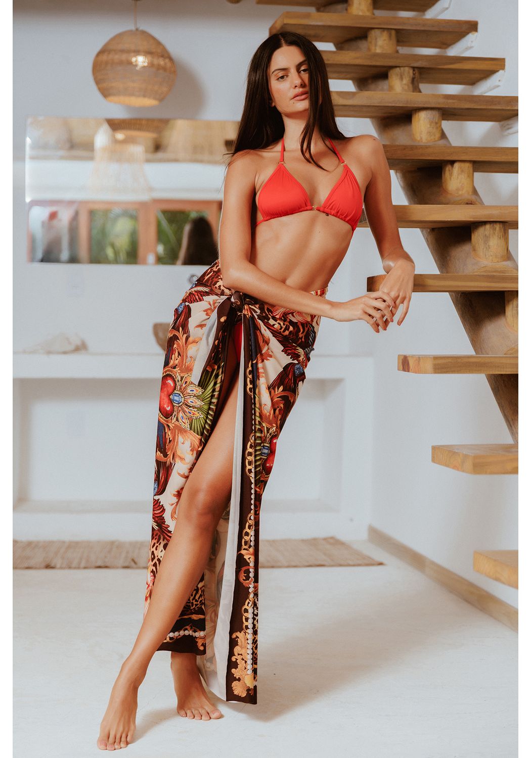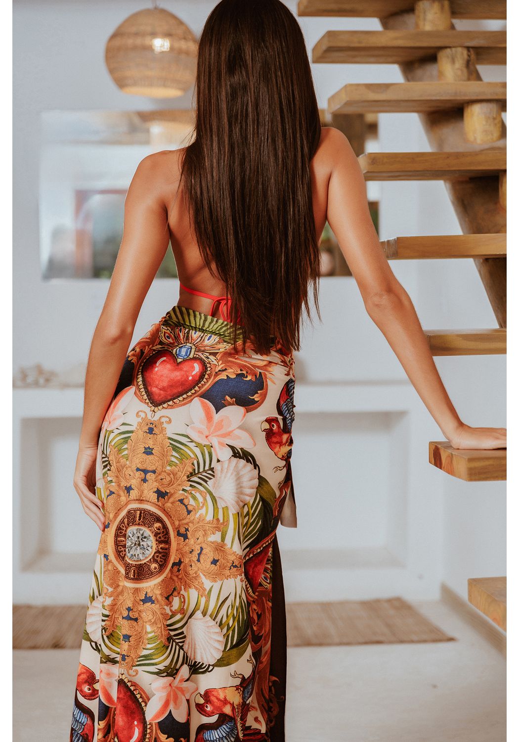 Canga pareou Scarf sacratta (estampa exclusiva): Super confortável e com diversas possibilidades de uso e amarrações, peça delicada super versátil ideal para dias de praia e piscina. inspirado no estilo barroco tropical. A estampa vibrante combina elementos luxuosos como corações com joias, conchas, flores tropicais, pássaros exóticos e arabescos dourados. I