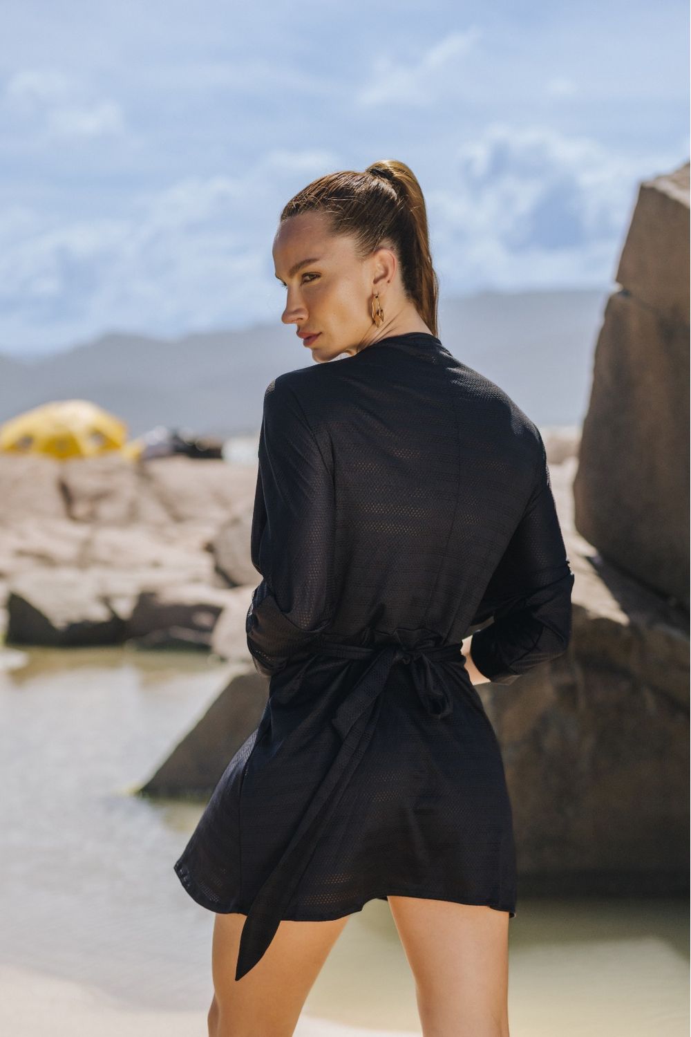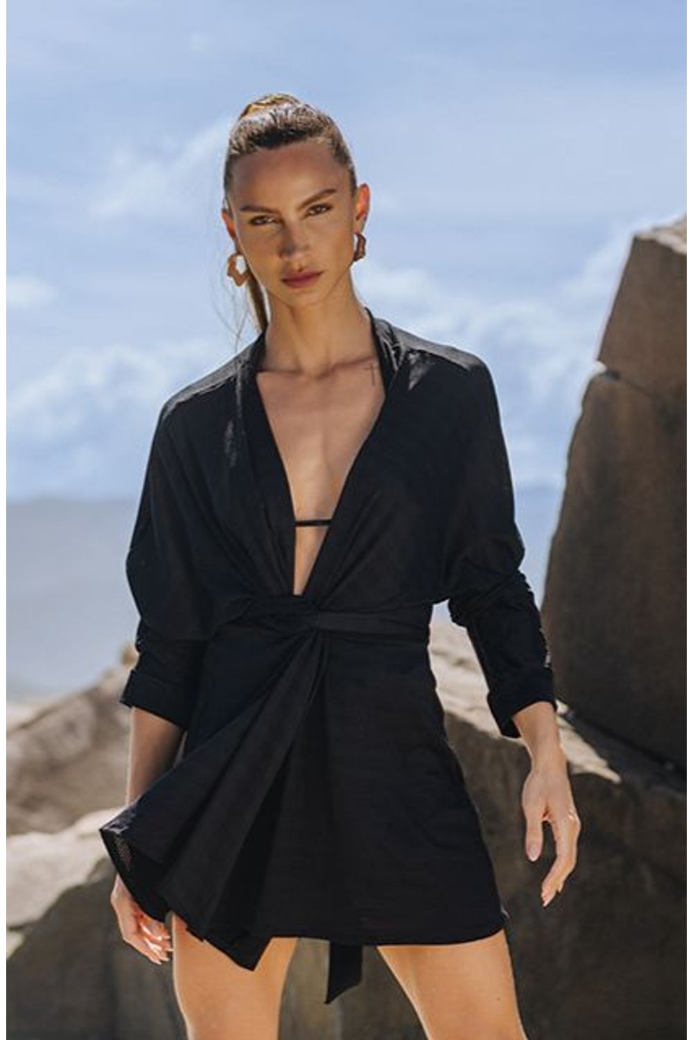 Chemise Bali Preto:  Saída curta tipo chemise com amarração frontal, modelagem contemporânea super moderna. Saída com mangas compridas, e bem fresquinha, produzida com tecido leve e delicado.