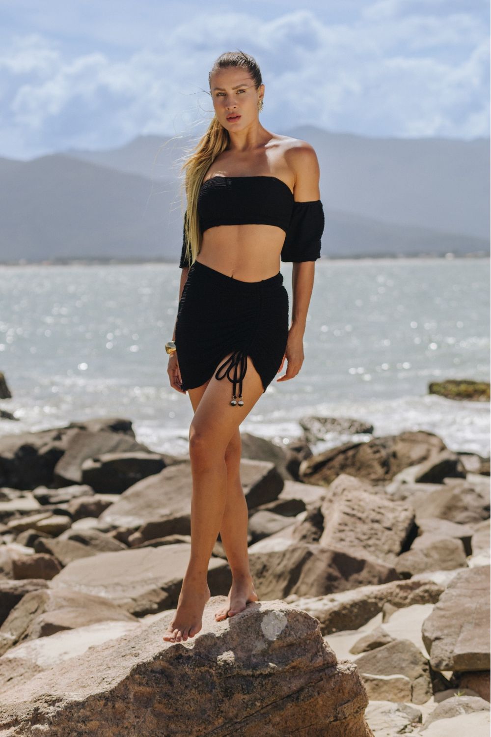 Saia Plissê Preto: Saia curta com plissados, possui cordões para ajustar o look de acordo com o estilo da pessoa, podendo deixar mais curto ou mais logo da forma que preferir.