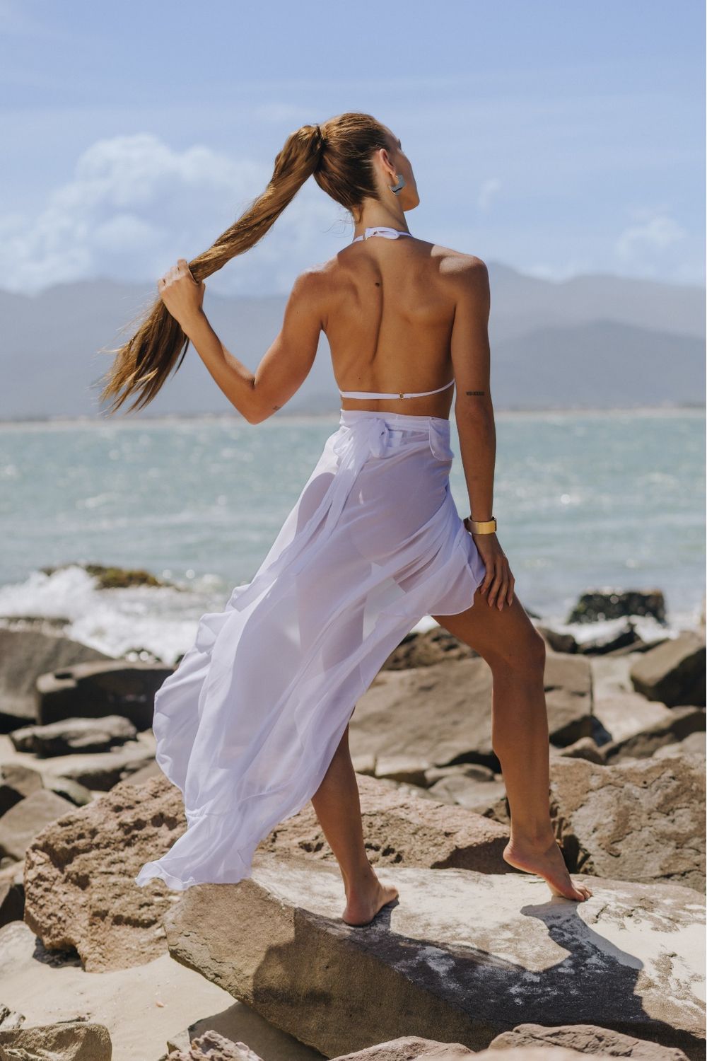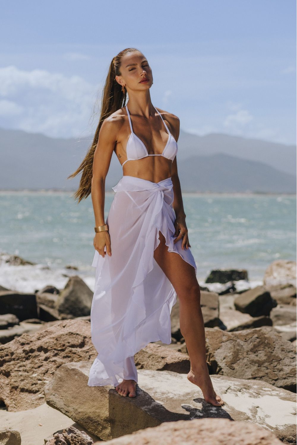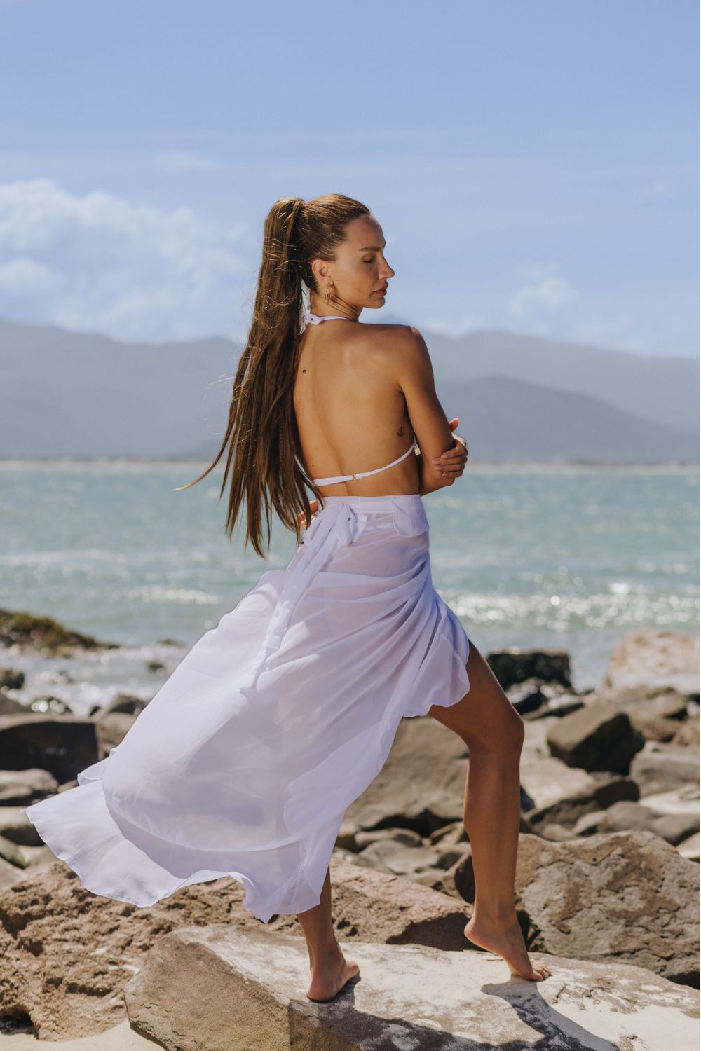 Saia Positano Branco:  estilo pareou com um recorte lindo que deixa a saia cheia de babados, deixando o look super delicado e glamouroso. Comprimento um pouco mais longo,  possuí  leve transparência. Uma ótima opção de saída de praia, super prática e que combina com quase tudo.